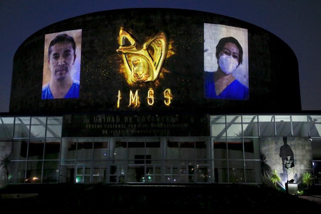 A través del “Mural a los Héroes de la Salud” se proyectan sobre la fachada de la Unidad de Congresos del Centro Médico Nacional Siglo XXI más de 100 imágenes y mensajes ciudadanos publicados en redes sociales, como un homenaje a la destacada labor del personal médico del IMSS en esta emergencia sanitaria.