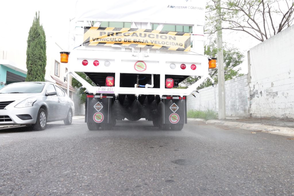 El camión recorrerá las calles ocho horas en martes y jueves, y cuenta con esparcidores para 8 mil litros de sanitizante en la parte lateral y trasera, lo que permite la desinfección de banquetas y calles completas.