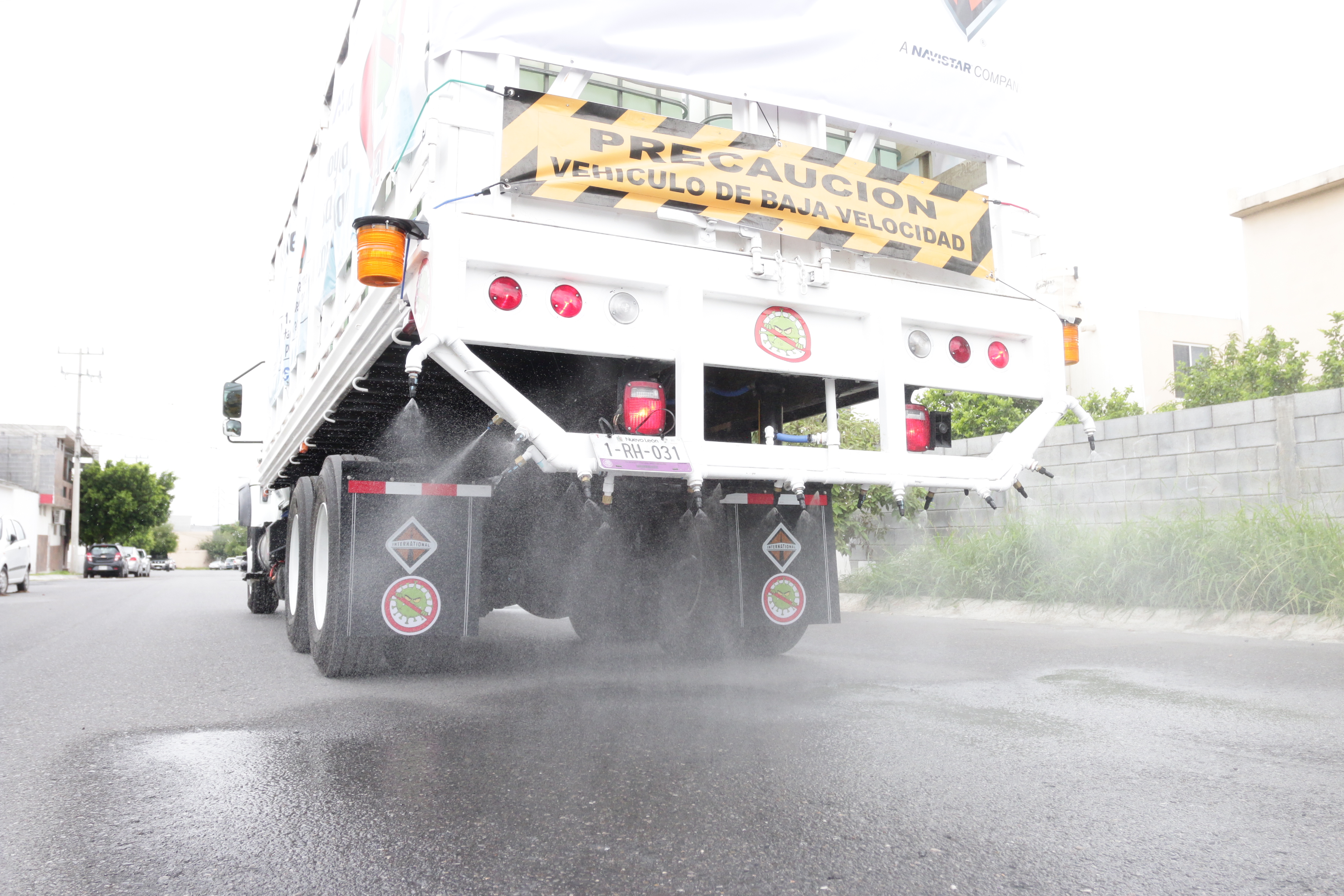 El camión recorrerá las calles ocho horas en martes y jueves, y cuenta con esparcidores para 8 mil litros de sanitizante en la parte lateral y trasera, lo que permite la desinfección de banquetas y calles completas.