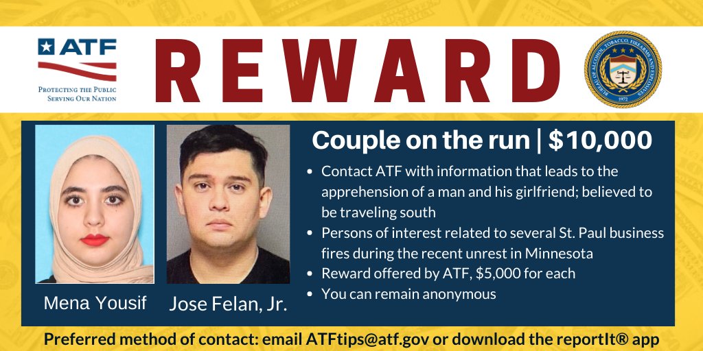 Austin, Texas,- El Buró Federal de Alcohol, Tabaco, Armas y Explosivos o ATF por sus siglas en inglés, informó que busca a una pareja sospechosa de haber incendiado varios negocios en la ciudad de San Paui (Minnesota), durante los disturbios que se presentaron y que podrían estar en Texas.