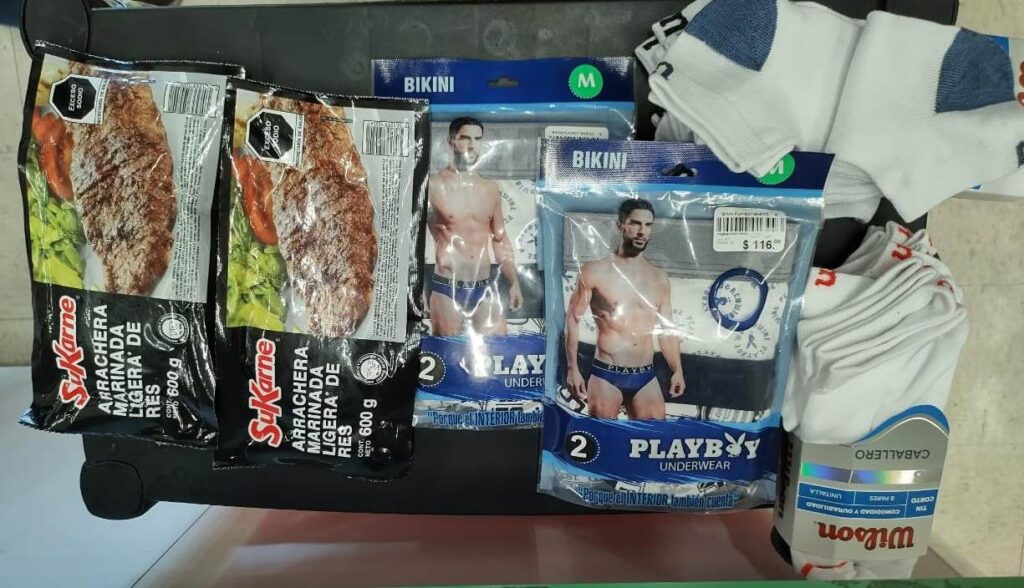Al cuestionarla por el ticket de compra no justificó  la mercancía y al proceder a la revisión, los elementos policiacos le encontraron  dos paquetes de carne para asar, dos paquetes de calcetines y ropa interior, todo con un valor  a los 800 pesos.