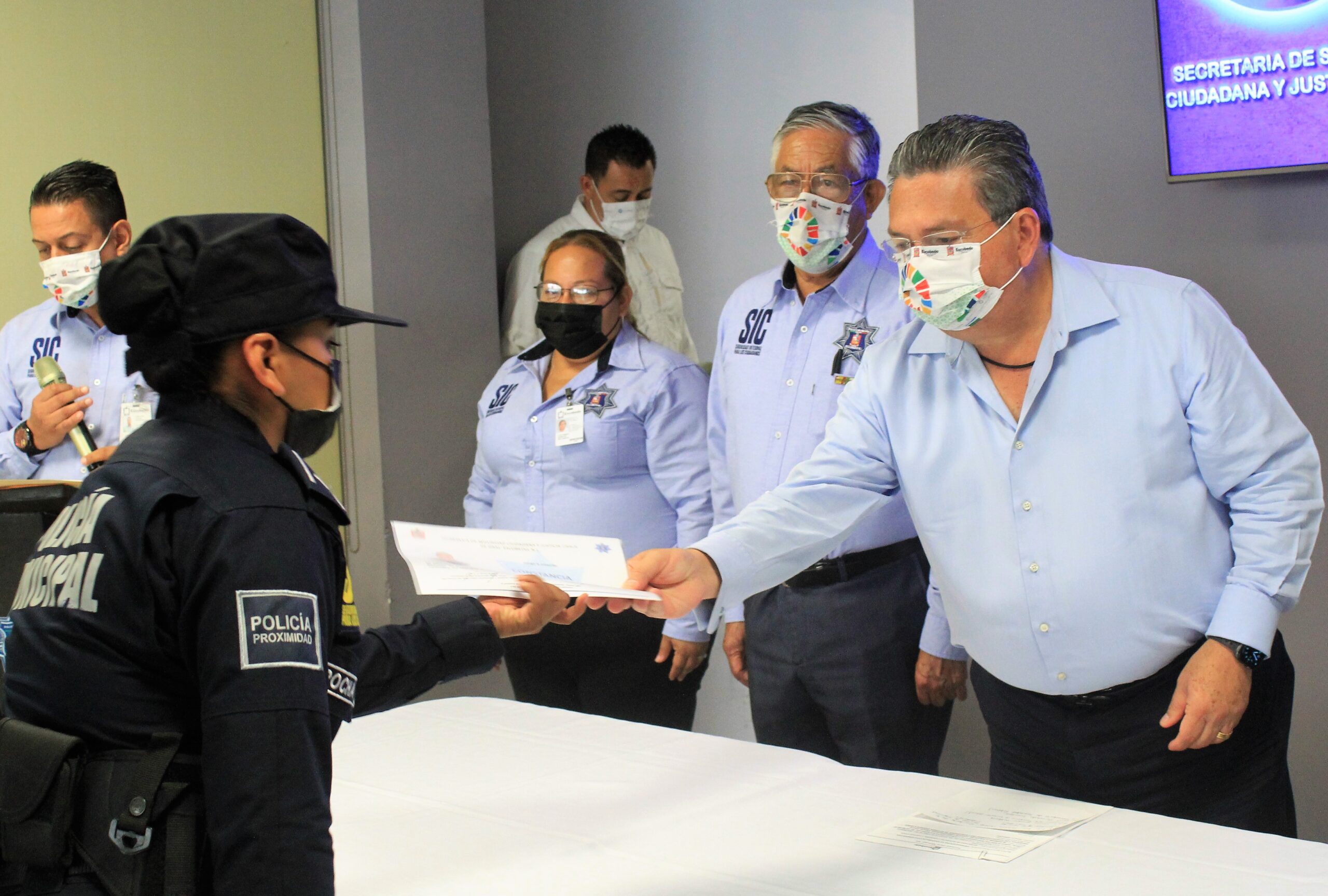 Acompañaron a José Antonio Quiroga Chapa, Hermelindo Lara Cruz, secretario de Seguridad Ciudadana y Justicia Cívica, José Luis Sánchez Cepeda, regidor de la Comisión de Seguridad, el Capitán Francisco Coronilla Palacios, director de Seguridad Ciudadana y Justicia Cívica y Luz María Gaspar, directora de la Academia de Formación.