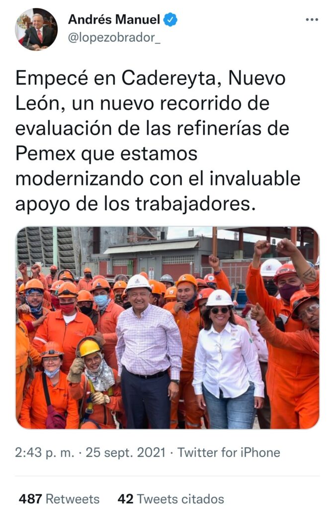 “Empecé en Cadereyta, Nuevo León, un nuevo recorrido de evaluación de las refinerías de Pemex que estamos modernizando con el invaluable apoyo de los trabajadores”, escribió luego en su cuenta de Twitter.