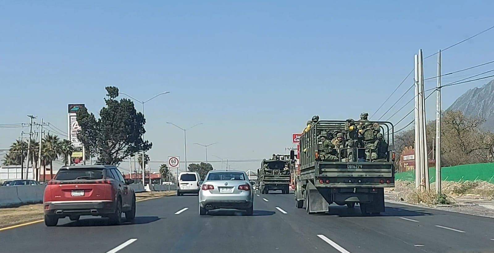El convoy en unos 20 vehículos transportaron a elementos de la Marina y el Ejército Mexicano que llegaron a Nuevo León por la carretera nacional y la avenida Garza Sada, al sur.