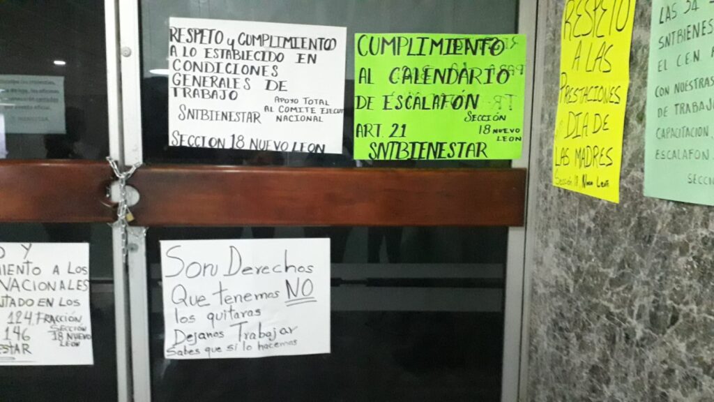 Monterrey- Trabajadores de la Secretaría del Bienestar en Nuevo León se unieron a la protesta nacional que realizaron para exigir el cumplimiento de mejores condiciones laborales.