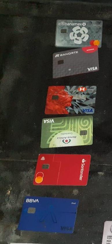 Tras revisarlos les encontraron seis tarjetas bancarias y aproximadamente 12 credenciales de elector, presuntamente apócrifas, que no pudieron comprobar su procedencia.