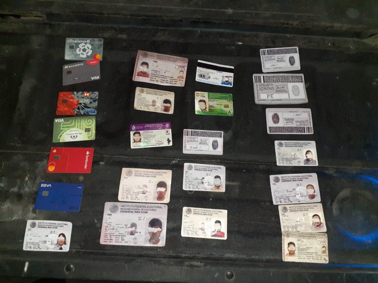 Tras revisarlos les encontraron seis tarjetas bancarias y aproximadamente 12 credenciales de elector, presuntamente apócrifas, que no pudieron comprobar su procedencia.