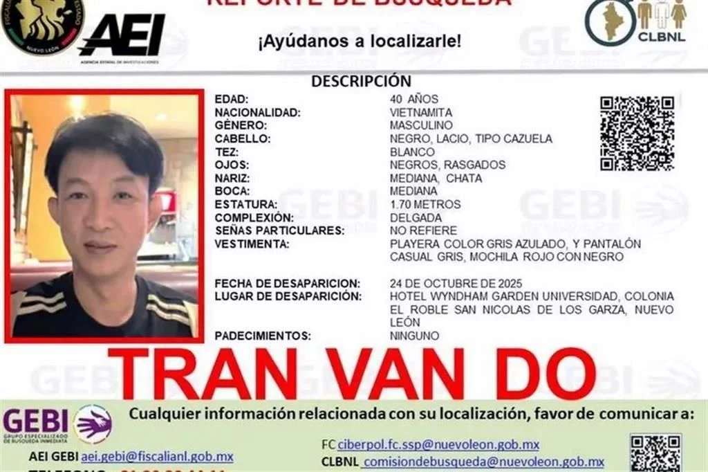 Un hombre originario de Vietnam, desapareció en el municipio de San Nicolás de los Garza, al norte de la zona metropolitana de Monterrey, y no había sido localizado, al menos hasta la medianoche del domingo, por lo que la Fiscalía de Justicia emitió una alerta de búsqueda.