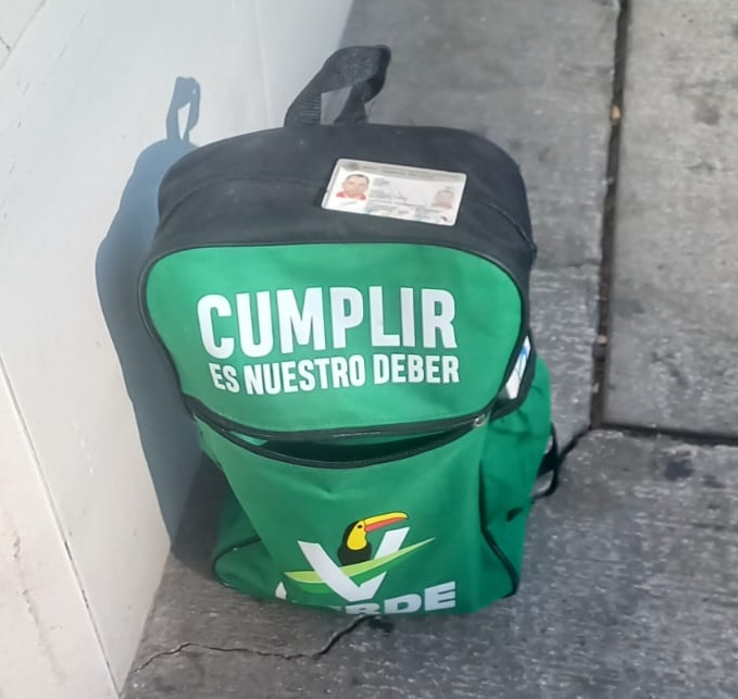 La mochila, con el logotipo de un partido político, estaba sobre la banqueta y fue vista por una señora, quien de inmediato llamó a la Policía.