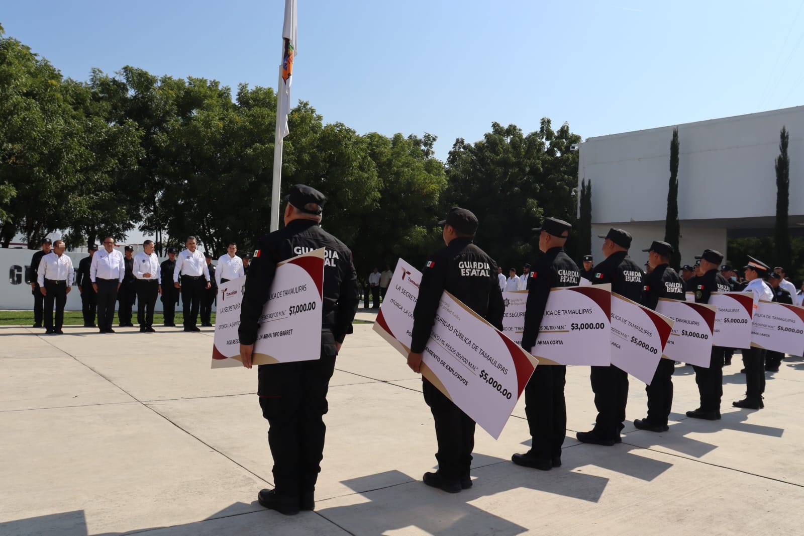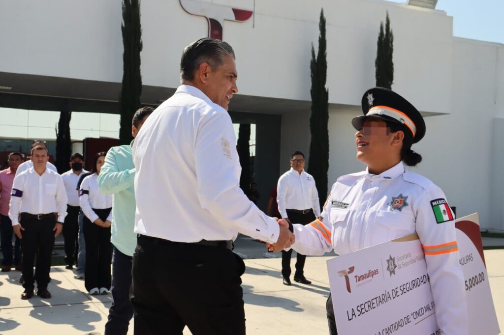 Con una ceremonia encabezada por el secretario de Seguridad Pública de Tamaulipas, Mtro. Carlos Arturo Pancardo Escudero, recibió a los siete elementos galardonados, entre ellos, una integrante de la Dirección de Tránsito Estatal, quienes durante el pasado mes aseguraron 14 armas largas, cinco armas cortas y cuatro explosivos.