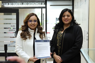 La presidenta de la mesa directiva, Itzel Castillo Almanza, recibió de la titular del InfoNL, Brenda González Lara, el documento que fue remitido a la Oficialía de Partes para que se remita al Pleno en la próxima sesión.