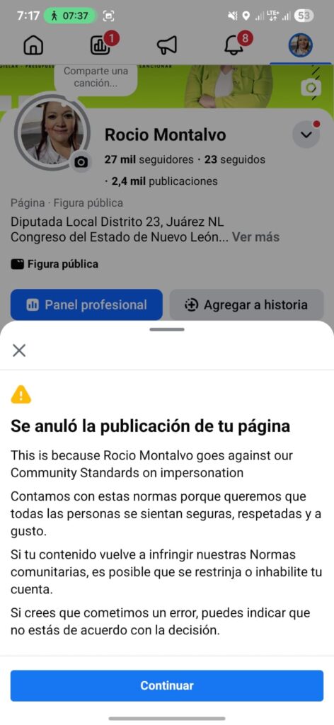 Monterrey, N.L. – La diputada independiente Rocío Maybe Montalvo Adame denunció esta mañana un ataque orquestado de “bots” que resultó en la eliminación de su página oficial en Facebook, @RocioMontalvoNL. La legisladora calificó este acto como un intento de censura directa tras sus recientes acciones para transparentar el gasto público del municipio de Juárez y exigir al Gobierno del Estado la publicación de la iniciativa de Tarifas Sociales.