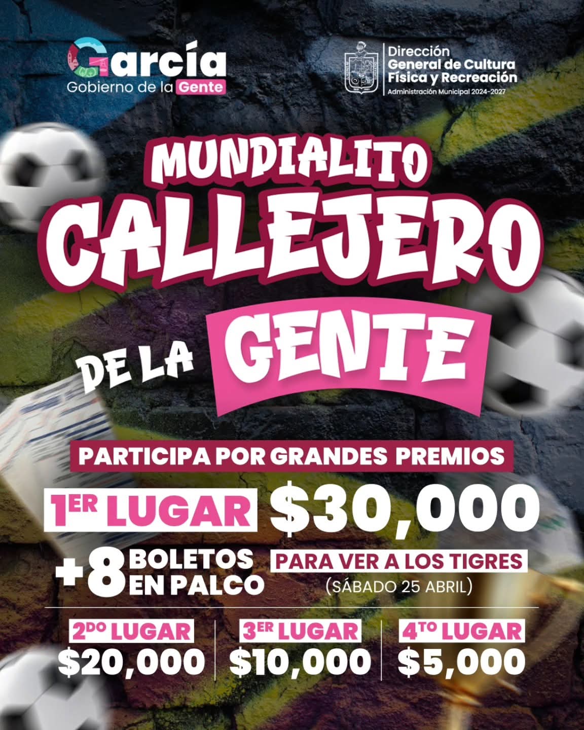 El Gobierno Municipal de García, encabezado por el alcalde Manuel Guerra Cavazos, lanzó la convocatoria para participar en el “Mundialito Callejero de la Gente”, un torneo que busca impulsar el deporte, la sana convivencia y la participación de las y los jóvenes del municipio.