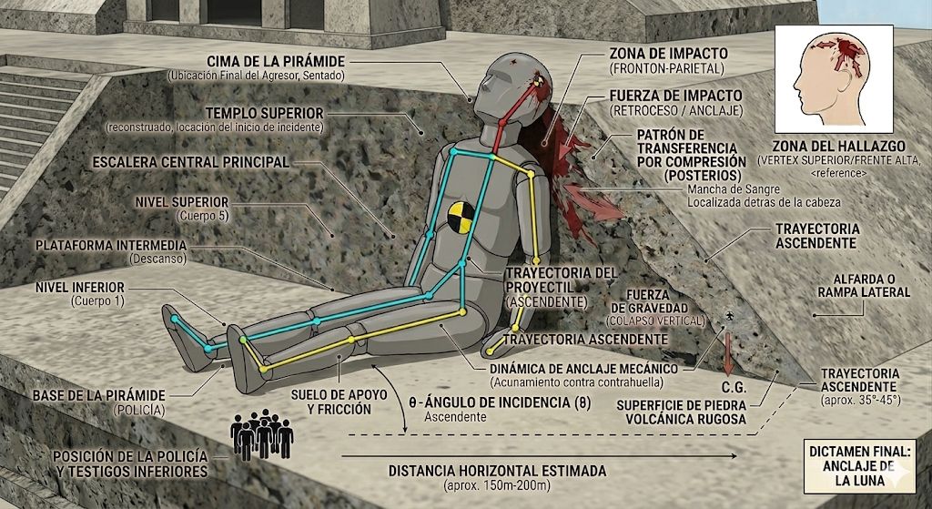 “Al revisar la imagen de la herida del agresor, lo primero que se observa es una posible trayectoria balística ascendente, con un origen estimado en la base de la pirámide. El proyectil no se sabe con exactitud dónde habría impactado, pero la salida se ve claramente en la región del vértice superior, un punto crítico para la transferencia de energía.